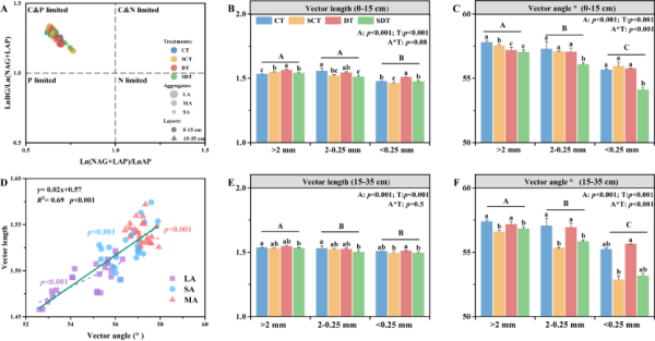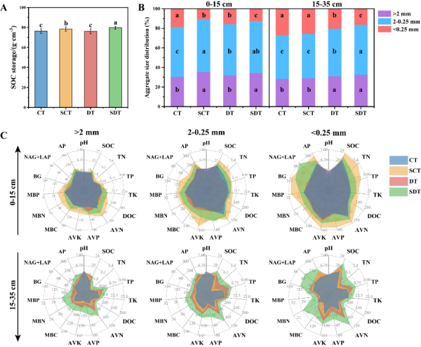 近期,中国科学院东北地理与农业生态研究所黑土保护与利用学科组,依托秸秆还田定位试验,分析了不同粒径团聚体(>2 mm、2–0.25 mm、<0.25 mm)的有机碳和养分含量、微生物群落结构及其资源限制特征,揭示了秸秆还田通过团聚体中微生物资源限制影响有机碳储存的机制。研究结果显示,秸秆深翻还田(SDT)在0-35 cm土层中的土壤有机碳储量显著高于其他处理,较常规耕作(CT)、秸秆浅翻还田(SCT)和深翻(DT)分别提高了4.45%、1.71%和4.64%(图1)。秸秆还田(SDT和SCT)显著增加了>2 mm团聚体比例,提高了其养分含量和微生物生物量。酶化学计量分析进一步表明,秸秆还田能有效缓解了微生物的碳和磷限制,该效应在深翻条件下尤为显著(图2)。