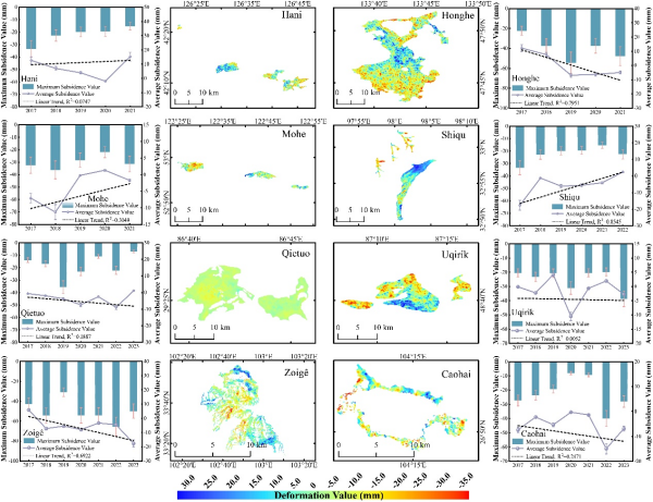 研究团队融合小基线集(SBAS-InSAR)时序干涉技术与机器学习模型,基于2017–2023年Sentinel-1卫星C波段雷达影像,实现了全国尺度泥炭地地表形变的高精度反演与预测,系统揭示了其空间格局与主要驱动机制。结果表明,我国泥炭地沉降现象普遍存在:若尔盖泥炭地平均沉降速率为−5.73 mm/a,最大沉降量超过−65 mm;草海泥炭地最大沉降速率达−39.91 mm/a;大兴安岭地区受多年冻土退化影响出现缓慢沉降,而长白山部分泥炭地则保持稳定。