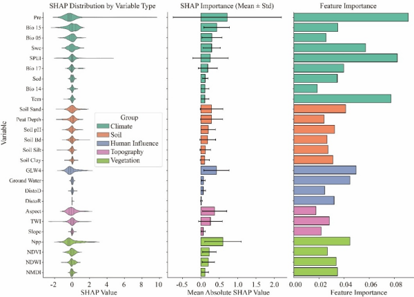 泥炭地垂直退化驱动分析结果表明,降水量(Pre,SHAP = 0.719)是影响泥炭地沉降的首要因子,净初级生产力 (NPP,SHAP =0.600) 、干旱指数 (SPEI,SHAP =0.554)和牲畜密度 (Livestock density,SHAP=0.427) 紧随其后。气候干旱化与放牧扰动的叠加是驱动西部泥炭地垂直退化的关键机制,而冻土退化则成为寒区泥炭地的新型驱动力。