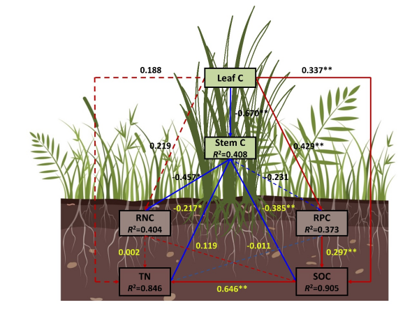 研究结果表明,叶片碳与根系磷的协同作用共同决定了土壤有机碳和全氮含量;同时,叶片碳与茎碳含量之间的权衡关系也影响了有机碳和全氮的积累,说明地上与地下性状的相互作用在半干旱区湿地土壤碳氮累积中具有重要调控作用。此外,相比于地上性状,根系性状组合及其关联关系也可作为评估退化湿地植物多样性与生物量的可靠预测指标。在灌木入侵湿地中,土壤含水量的降低促进了植物多样性的增加,但导致典型湿地物种减少,这一过程通过叶面积与叶片干物质量之间的权衡关系实现,并受到土壤pH的显著间接调控。