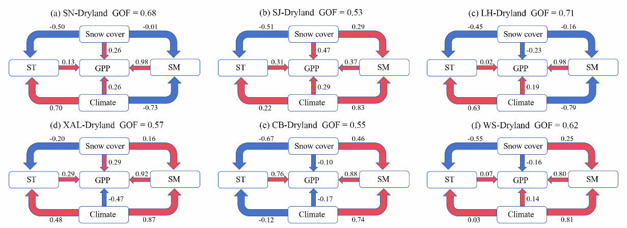 图2 基于PLS-SEM的东北地区不同农业区积雪通过土壤水热影响旱田GPP的作用路径。ST和SM分别代表土壤温度和土壤水分