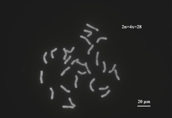 图3 羊草根尖细胞染色体荧光显微图