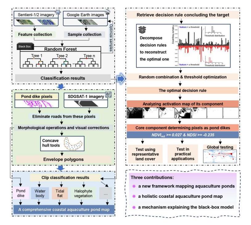 为解决上述问题,东北地理所地理景观遥感学科组赵传朋副研究员等科研人员以养殖塘堤坝为切入点,应用卫星遥感数据提取堤坝,解析堤坝包围的土地覆被作为养殖塘区域。以中国海水养殖塘为对象,率先构建了包含水体、堤坝、滩涂、植被及附属设施的全要素养殖塘分布。在此基础上,应用模型转译方法,挖掘养殖塘堤坝遥感识别的核心机理,实现了遥感指数的功能重定向应用。