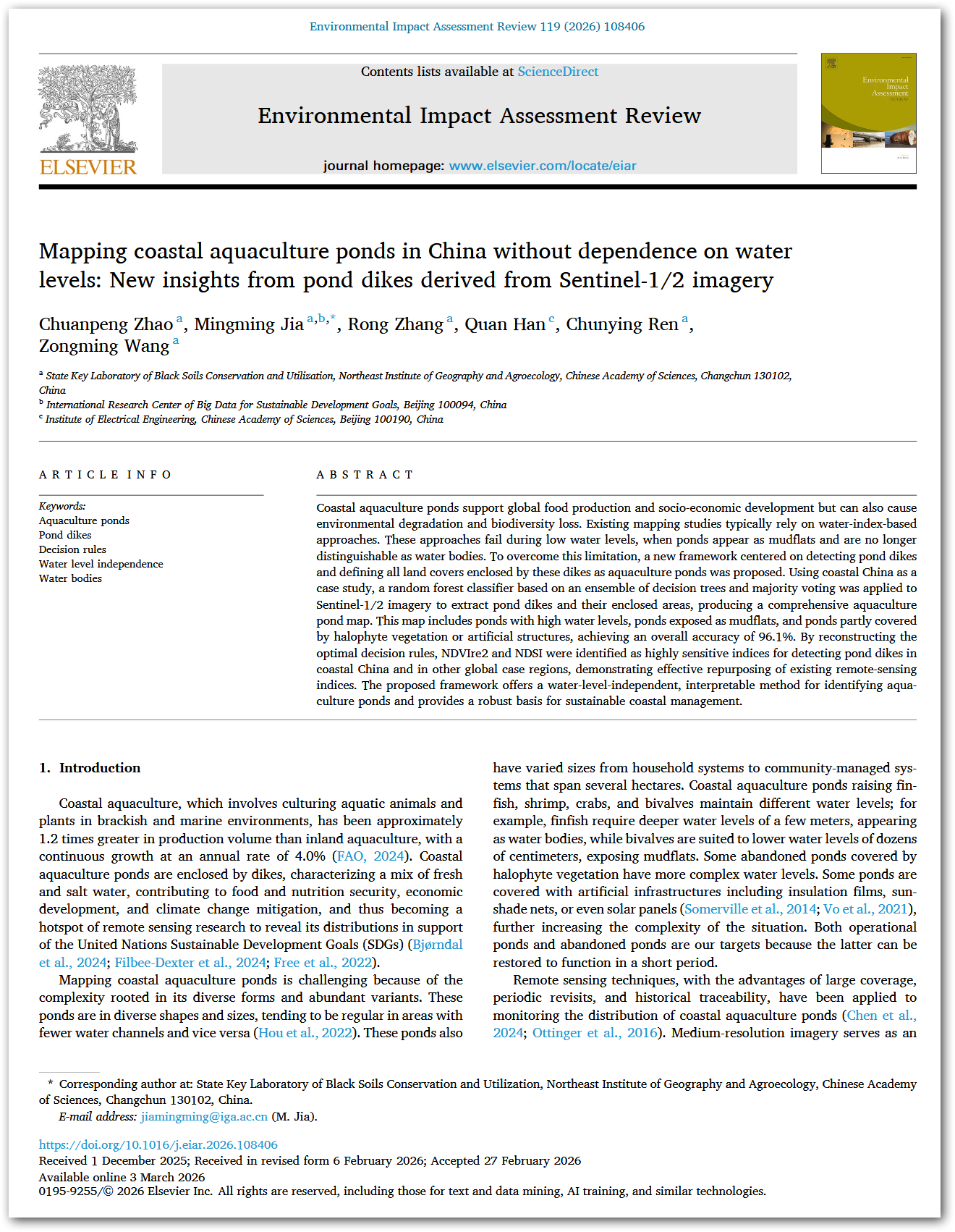 本研究由东北地理所赵传朋副研究员、贾明明研究员,张蓉特别研究助理,任春颖研究员、王宗明研究员共同完成,得到国家自然科学基金(No. 42330109)、吉林省优秀青年基金(No. 20250101045JJ)、国家重点研发计划青年科学家项目(2022YFF1302000)、中国科学院青年创新促进会人才项目(No. 2021227)共同资助。