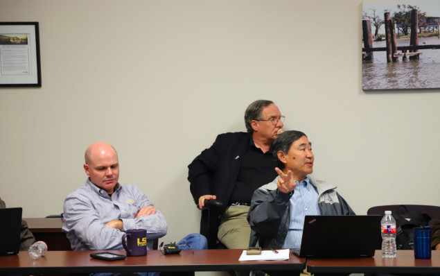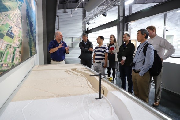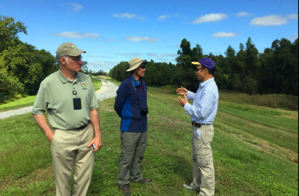 10月16 -17日,在路易斯安那州自然资源部海岸管理办公室Ed Britton博士、路易斯安娜州立大学海岸与环境学院院长Christopher D'Elia教授、侯爱新教授等相关专家陪同下,参观了建造过程中的密西西比河流中心,详细了解了密西西比河三角洲湿地大型实景模型模拟的建造过程和未来使用情况。前往墨西哥湾,深入考察了红树林及河口三角洲湿地恢复工程。由于海平面上升和陆地下沉导致湿地大面积丧失,路易斯安那州政府利用河口及滨海的底泥,疏浚到被淹没的湿地区域,提高地表以恢复退化盐沼。项目组考察了不同恢复年限下的湿地恢复区,针对其湿地植被演替、基质理化性质及水文情势变化进行了深入探讨,这为我国湿地基质恢复、应对海平面上升的滨海湿地恢复技术提供了良好的案例。