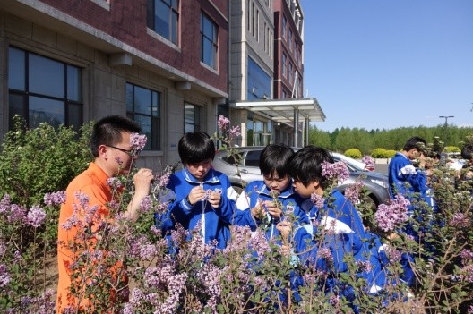 在湿地标本馆,刘波博士为同学们讲解了如何收集、制作和保存植物标本,并做了题为“花的世界”的主题科普报告。刘波博士带领同学们在所内园区进行野外植物的观察活动,他以忍冬,红瑞木和丁香为例,通过学生亲手解剖朵花,观察花的结构和类型,以小组活动的形式,辨认花冠的类型,两性花和单性花。同学们在亲自实践中,发现问题,学习知识,现场气氛十分活跃。