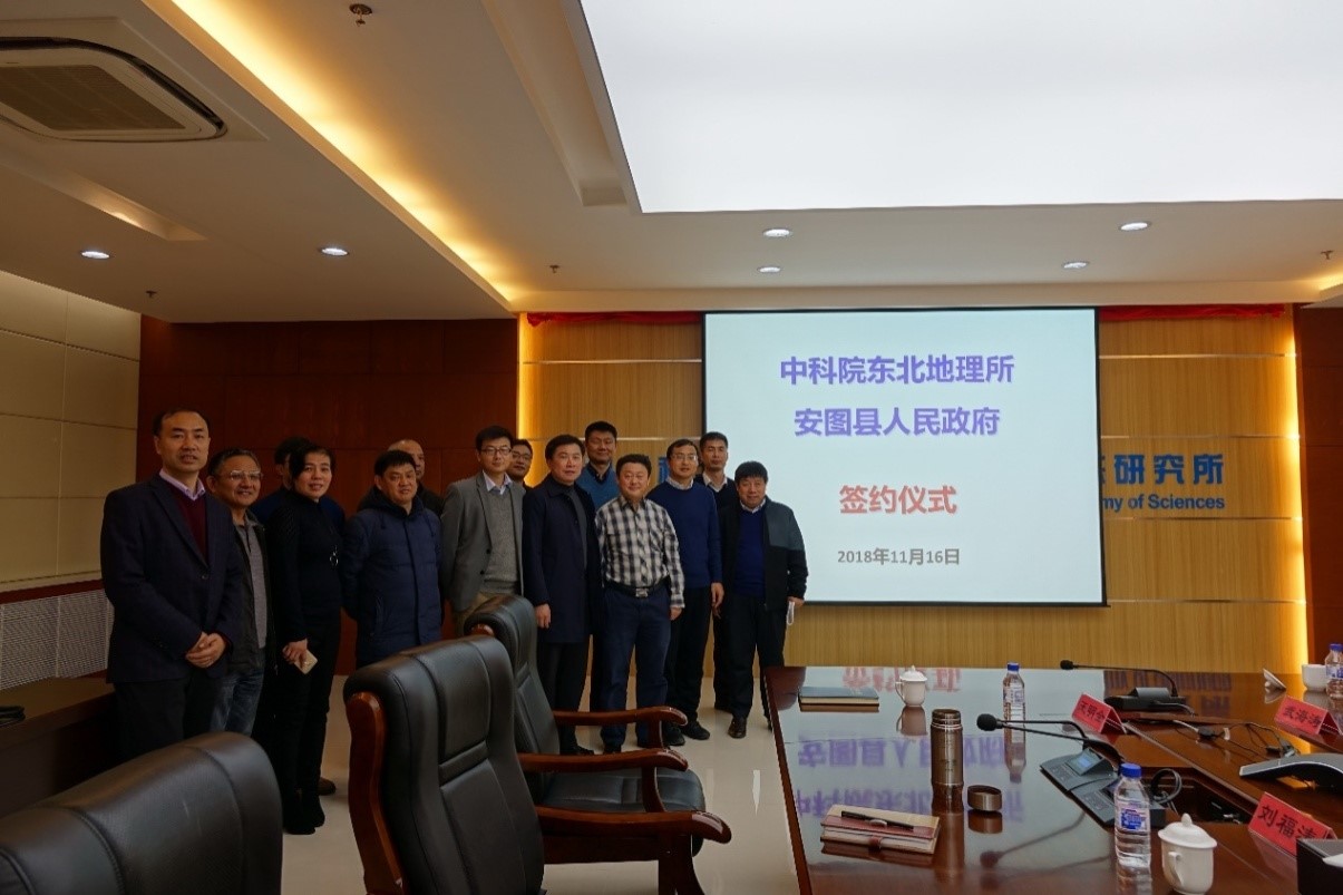 2018年11月16日,东北地理所与安图县人民政府在长春签署了战略合作协议,并召开了科技对接座谈会。东北地理副所长姜明研究员、所长助理王宗明研究员,安图县副县长董振国、安图县政协副主席黄明镇、副县长樊俊出席了签约仪式。会议由王宗明所长助理主持。