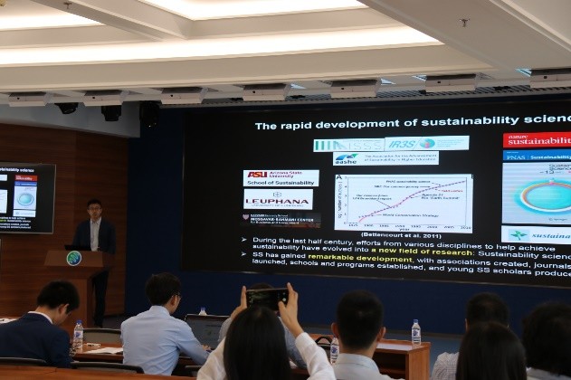 来自北京师范大学的房学宁博士基于文献综述做了题为“什么样的科学是可持续性科学?——基于实证的再检验”的学术报告;美国亚利桑那州立大学的周兵兵博士做了大量的文献调研,并从多个角度阐释了“可持续性科学不等于可持续发展研究”;两个报告详细介绍了可持续科学的定义、科学内涵、研究主题、历史发展等。从可持续科学理论框架与实际应用角度,浙江大学黄璐博士做了题为“整合地理设计与景观可持续性科学”、中科院北京地理科学与资源研究所的刘海猛博士做了题为“人与自然“耦合魔方”:概念内涵与理论框架”的精彩学术报告,本环节报告由中科院东北地理所毛德华副研究员主持。