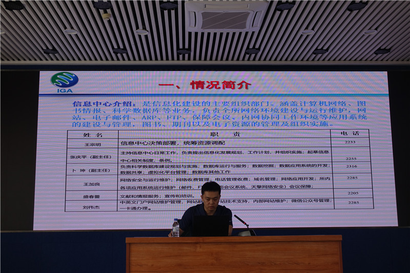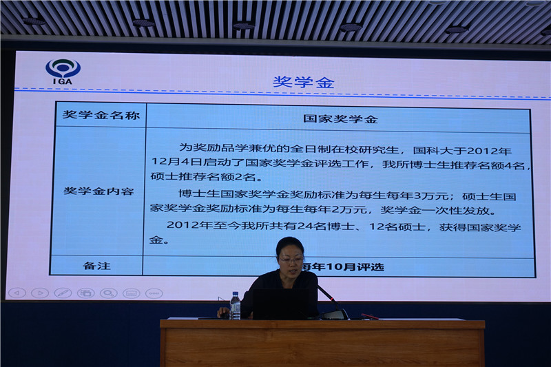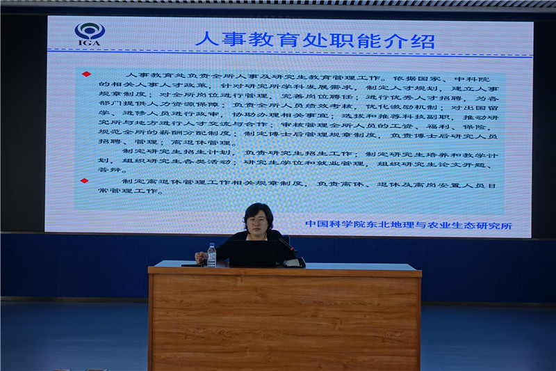 此外,科研计划处武海涛处长、监察审计室李颖副主任、信息中心王加良老师和盛春蕾老师、人事教育处吴秋菊老师、后勤与基建管理办公室李晓东老师、分析测试部赵海洋老师针对各部门职能分别作了报告,内容涉及研究所科研项目及成果管理、科研学术道德及廉政建设、信息化工作、馆藏图书和文献信息资源及使用、薪酬和绩效考核、安全教育和大型实验仪器及其功能等。研究生管理部王玉荣主任、侯雪莹老师及高莹老师针对全体研究生做了关于研究生培养和学位申请的相关规定及奖助学金管理办法的专题讲座。