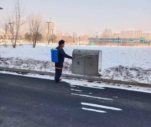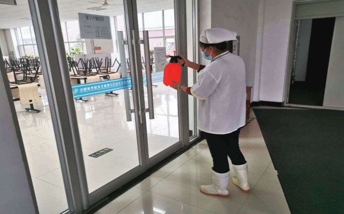 在各办公楼的楼道总会闻到一股消毒液的味道,虽然味道比较刺鼻,但是会让职工的心里感到一丝宽慰。每天后勤部门组织人员对所区重点防控部位进行两次消杀,两天进行一次全所范围消杀。