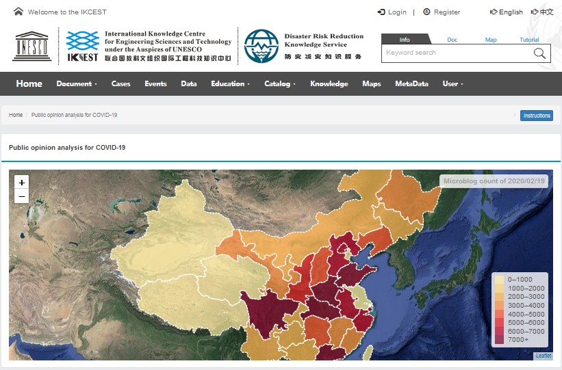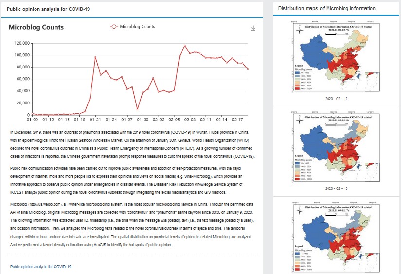 东北地理所自2016年来一直参加国际工程科技知识中心—防灾减灾知识服务系统(DRRKS)的开发建设工作。本次疫情期间,我所信息中心作为主要技术团队,配合中国科学院地理科学与资源研究所开展工作,负责舆情相关信息在微信公众号的信息推送以及 DRRKS 中英文知识应用的开发工作。通过使用开源 WebGIS 技术与工具,对疫情相关的舆论信息在地理空间位置上进行可视化表达,对于信息公开及充分了解大数据背景下疫情舆论的时空差异及其变化具有重要意义。