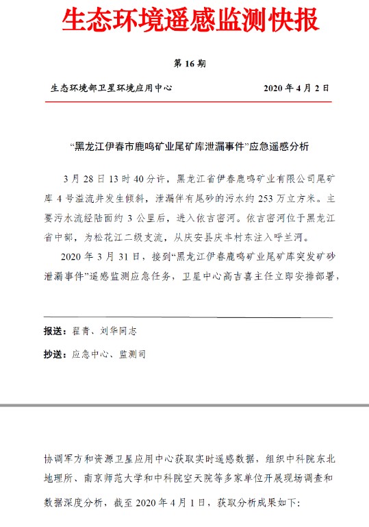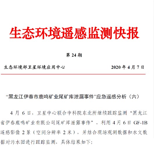2020年3月28日,黑龙江省伊春市鹿鸣矿业有限公司钼矿尾矿库4号溢流井发生倾斜,泄漏伴有尾砂的污水约253万立方米,污水流出约3公里后进入依吉密河。黑龙江省委、省政府立即启动Ⅱ级应急响应并成立应急抢险指挥部,生态环保部应急指导组副部长翟青等带领专家组赶赴现场指导应急处置工作,迅速联合制定了“堵水源、截水头”的具体处置方案。按照专家组意见,在“泄漏水头”设置10道拦截坝,减缓降低尾矿浆水下泄速度和浓度,采取投放絮凝剂、活性炭的方式,对污染物进行吸附和絮凝沉淀,防止污染物向下游迁移。截至目前,泄漏点已完成封堵,事件取得阶段性重要进展,依吉密河下游污染物浓度大幅下降,上游河段已经开始启动清淤工作;随着污水团向下游迁移,呼兰河中的污染峰值在逐步衰减。据应急专家分析研判,尾矿坝不存在安全风险,下游农田环境风险和饮用水安全风险可控。