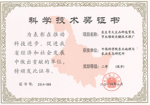 2014年8月8日,黑龙江省科学技术奖励委员会公布了2014年黑龙江省科学技术奖励决定,我所“东生号大豆品种选育及节本增效关键技术推广”项目获得科技进步二等奖。