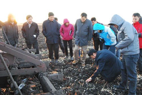 韩晓增研究员向各位领导汇报了海伦站近30年来在黑土保护及其农田地力提升方面的科学研究、技术研发和成果转化等方面的最新进展,着重介绍了“黑土演化”与“退化”过程:将黑土变化分成三个时期、七个过程,其中黑土退化只是七个过程之一;明确了自然黑土经过开垦后,土壤有机质含量下降是自然生态系统向农田生态系统转化的必然结果,农田黑土有机质是可以调控的,其中秸秆还田是调控有机质最可行的措施之一。针对海伦站长期定位试验,韩晓增站长还介绍了自然黑土保护、耕地黑土保护和秸秆还田技术、保护性耕作技术、轮作技术、有机肥施用技术及由这些技术集成后的大豆、玉米双增产的高效种植模式。钱克明等领导对这些研究成果非常感兴趣,在田间不断提出各种问题,充分肯定了海伦站在黑土方面的科研成果及其应用在农业生产中所发挥的积极作用。
