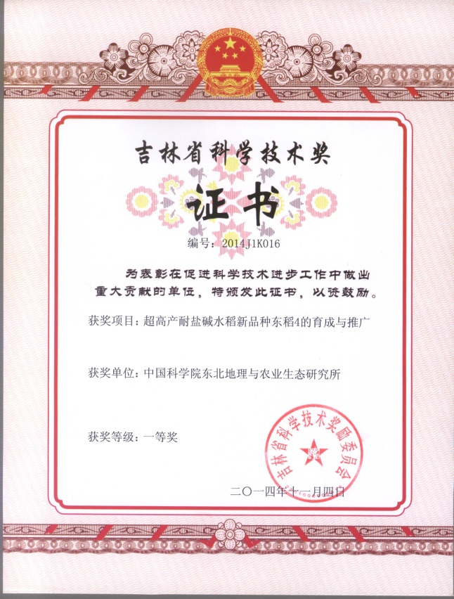 重点培育三“苏打盐碱地高效治理关键技术与示范”的成果采用地理远缘杂交、穿梭育种等先进育种技术,历时16年成功育成东稻4号水稻新品种。该品种集高产、优质、多抗、理想株型及广适性于一体,尤其是耐盐碱性和抗稻瘟病性,均明显优于吉林省其他主推品种;2010年获吉林省水稻新品种高产竞赛一等奖,亩产849.37公斤,创吉林省历史最高纪录;2011年获全国优质食味粳稻品评一等奖。东稻4已成为吉林省中早至中熟的主推品种,2010-2014年东稻4在吉林省累计种植面积达367万亩,在全国其他适宜地区推广170万亩,社会经济效益极其显著。该成果为水稻育种亲本应用、育种方法和鉴定技术的改进提高奠定了基础,对推动吉林省水稻生产发展,保证国家粮食安全具有重要作用。