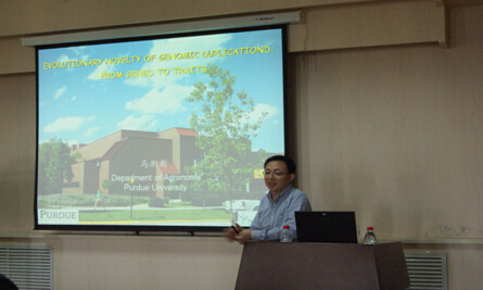 2015年7月3日,“大豆分子设计育种”创新团队国际合作伙伴--美国普渡大学马渐新教授来我所做了题为“Evolutionary novelty of genomic duplication:from genes to traits”的精彩学术报告。报告会由实验室副主任孔凡江研究员主持,长春所区和哈尔滨园区的相关科研人员和研究生听取了报告。