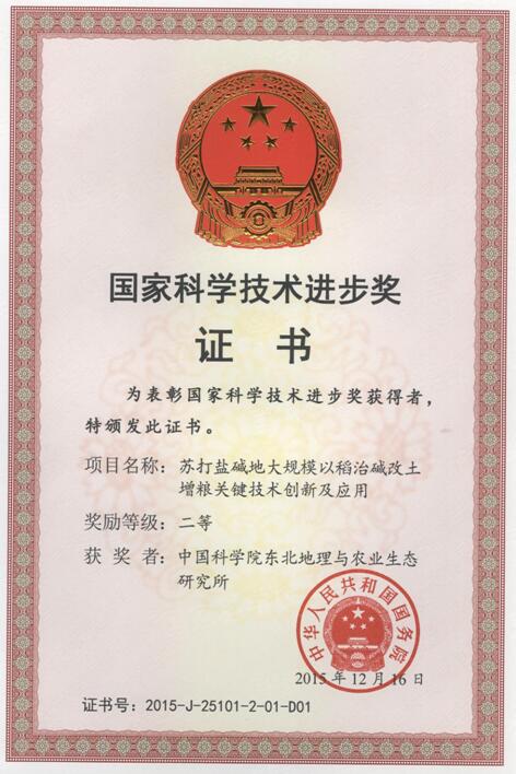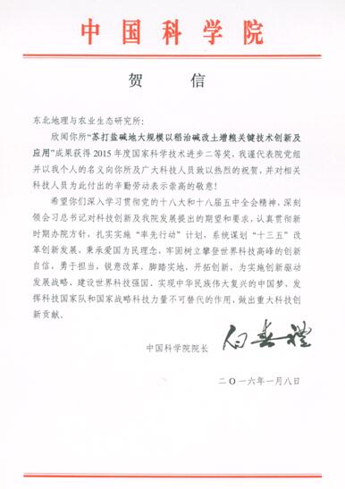 其中,由中国科学院东北地理与农业生态研究所为第一完成单位,吉林省农业科学院、吉林农业大学、吉林省白城市农业科学院以及通化市农业科学研究院等5家单位共同参与完成的“苏打盐碱地大规模以稻治碱改土增粮关键技术创新及应用”重大成果获2015年度国家科技进步奖二等奖。项目第一完成人梁正伟研究员代表获奖项目组出席了奖励大会,受到了习近平主席、李克强总理等党和国家领导人的亲切接见并合影留念。1月8日中国科学院院长白春礼院士也向我所发来了贺电。