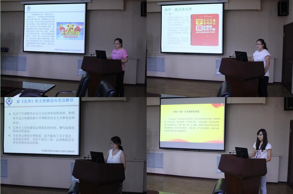 会上,行政机关党支部赵春萍同志作了《积极参加“两学一做”做合格党员》;大豆党支部翟红同志作了《认真学习党章党规、习总书记系列重要讲话,增强党性修养》,黑土党支部严君同志作了《以党章为镜 锤炼党性作风——学习 “两学一做”心得体会》,研究生党支部王亚英同志作了《“两学一做”学习心得》,各支部同志结合近期的“两学一做”学习教育畅谈了自己学习体会。
