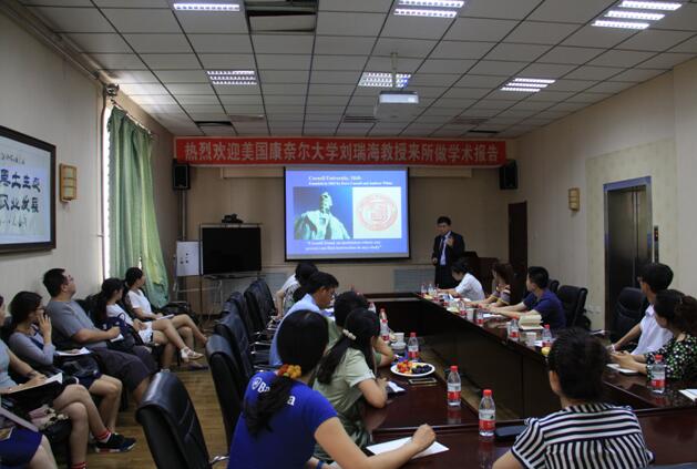 2016年8月2日,应东北地理所野生植物资源保护与利用课题团队赵恒田研究员邀请,美国康奈尔大学食品科学系终身教授(兼毒理系教授)、国际食品科学学院院士刘瑞海在农业技术中心做了关于“植物活性物质对慢性病预防” 的学术报告。