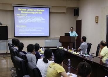 访问期间Henry T. Nguyen教授介绍了美国密苏里大豆生物技术中心的研究领域及成果。他的团队主要从事大豆高产、抗包囊线虫及抗病性、非生物胁迫和大豆品质方面的分子遗传特性研究,目的是为美国大豆产业的发展提供良好基因资源。目前Henry T. Nguyen教授的团队利用分子遗传技术,育成了可代替橄榄油的高油酸大豆品种,已在生产上应用,预计在未来几年有望大面积推广。会议期间Henry T. Nguyen教授对参会师生提出的具体问题进行了详细的分析与解答。交流会后,俩位专家参观了我所的实验室和试验基地。