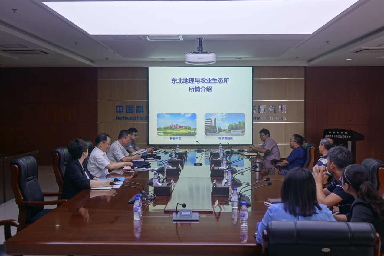 何兴元首先代表研究所对李博一行表示热烈欢迎, 并简要介绍了东北地理所在东北林区山水林田湖生态恢复关键技术集成与示范方面的科技成果情况。武海涛详细介绍了研究所“十三五”发展情况,并分别对研究所农业领域、湿地生态领域及遥感与区域发展领域科技成果做了重点介绍。宋开山从资源调查、参数反演、林地类型监测以及虫害监测等方面介绍了森林生态资源遥感监测技术的应用。赵恒田介绍了多个林下经济作物优势品种,并表示在禁伐的背景下,大力发展林下经济对提高经济效益是十分必要的,同时希望研究所的优势品种能够得到推广和转化,并建议双方在山水林田湖方面的科技成果、森林遥感监测技术应用和林下经济作物品种开发方面尽快开展实地调研,确定合作方向。