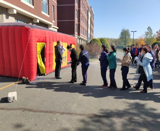 第二部分主要是模检验义务消防队火警快速反应能力、处置能力以及掌握消防技能熟练程度。继春季在研究生公寓模拟演练后,本次主要模拟演练试验办公区发生险情后中控室、消防设施设备运行状况、义务消防队其它各组即疏散引导组、安全防护救护组、通讯联系设施保障组以及启动消防应急预案等各环节的工作流程衔接。同时,本次演练还利用专用设备模拟了黑暗、停电和浓烟状态下的紧急场景,增加了员工的现场体验感。