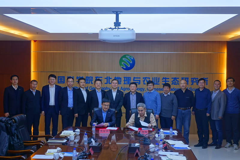 最后,中化环境创新战略部总经理李宏毅和东北地理所副所长李秀军代表双方签署科技合作战略协议,一致同意在资源共享、优势互补、合作共赢的前提下,发挥科研单位研发能力、企业产业化优势,创新投融资模式,开展密切合作,总结应用推广模式,服务更多市场需求。