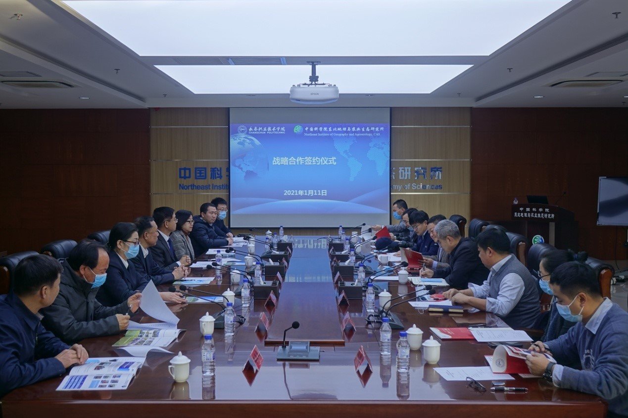 2021年1月11日,东北地理所与长春职业技术学院战略合作协议签字仪式在东北地理所举行。长春职业技术学院校长张湘富、副书记邹德明、纪委书记黄蓓、副校长王军、副校长朱国辉及相关人员一行三十余人参加了签字仪式。东北地理所所长姜明、副所长李秀军、副所长武海涛、大豆重点实验室主任冯献忠、黑土重点实验室主任田春杰、海伦实验站副站长李禄军、人事教育处处长郭琳、科研计划处副处长崔明星等参加了签字仪式。签字仪式由武海涛主持。