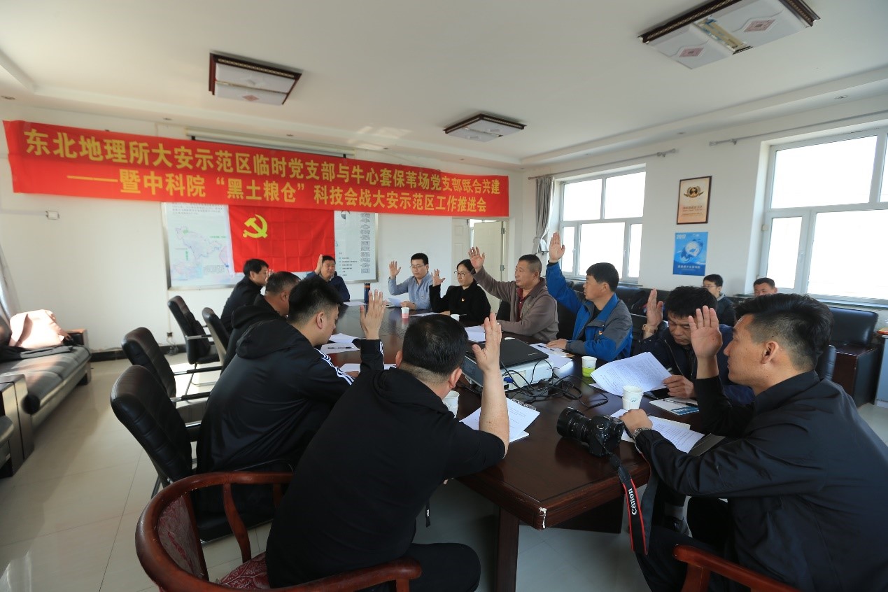 本次会议建立了东北地理所大安示范区临时党支部与牛心套保苇场党支部联合共建的新机制,树起了会战一线高高飘扬的第一面党旗,强化了党员在院地合作中的先锋模范作用,彰显了党组织在“黑土粮仓”科技会战中的战斗堡垒作用,示范区临时党支部的建立必将为“黑土粮仓”科技会战提供坚强的组织保障。