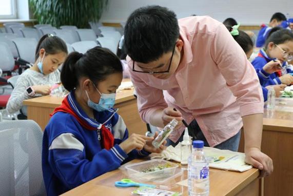 科普报告后,湿地生态与环境重点实验室张振刚博士带领同学们动手制作植物浮游瓶。同学们通过标本制作直观的了解了植物的结构特征,在科普志愿者的分组指导下,认真选取植物叶片和花朵,发挥想象力和创造力,组合成各式各样的美丽的植物浮游瓶。