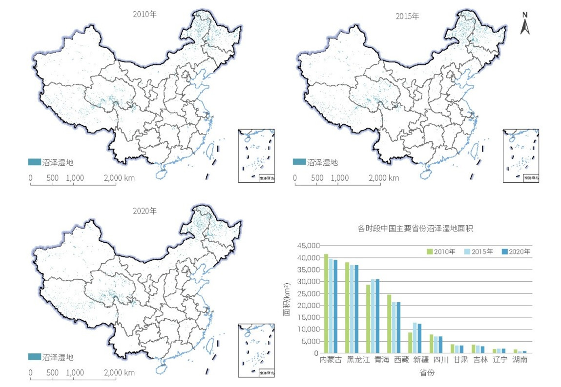 2010 年、2015 年和2020 年中国沼泽湿地空间分布