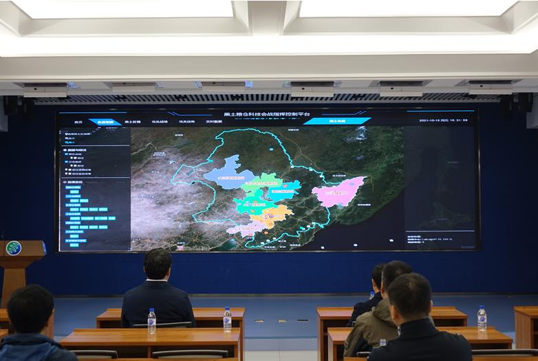 胡兆民一行首先调研了大豆分子设计育种重点实验室、中科院黑土区农业生态重点实验室的相关工作。于慧、张延博士及王志春研究员针对本领域相关科研进展和主要发展前景进行了介绍;随后共同参观了“黑土粮仓”科技会战指挥中心,从信息化平台上观看并了解各示范区的建设进展状况。