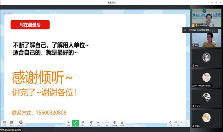 本次分享会,内容扎实、丰富且全面,帮助同学们有针对性的了解了目前就业政策和形势,有助于引导广大研究生明确就业方向、做好学业规划和求职准备。最后,衷心的感谢三位校友对东北地理所研究生就业工作的支持以及对学弟、学妹的关心。