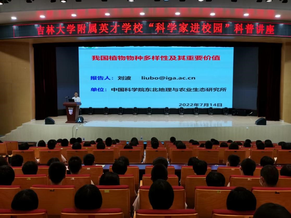 活动当天,吉林大学附属英才学校近200名师生参加了此次科普讲座。刘波博士采用图文并茂的方式,从生物多样性的定义讲起,重点介绍了我国植物物种多样性,结合多年积累的湿地植物图件,分别讲解了苔藓植物、蕨类植物、裸子植物和被子植物的特征。最后,通过“屠呦呦先生发现青蒿素”、“袁隆平先生发现水稻天然雄性不育株”、“孟德尔遗传定律”等生动案例,阐释了植物多样性的价值,及保护生物多样性的重要意义。