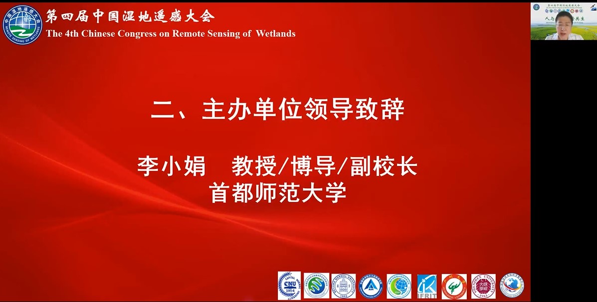 大会开幕式由首都师范大学资源环境与旅游学院柯樱海教授主持,首都师范大学副校长李小娟教授代表主办单位、承办单位致辞并强调“中国湿地遥感大会”已经具有良好的学术影响力和知名度,对于促进我国遥感科学与技术在湿地保护和修复中的深入应用,培养后备人才具有重要意义。中国科学院东北地理与农业生态研究所王宗明研究员,北京师范大学蒋卫国教授,中国科学院空天信息创新研究院牛振国研究员作为大会荣誉主席分别致辞,祝贺第四届中国湿地遥感大会顺利召开。