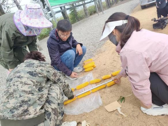 测产专家实地调查了曙光农场四分场、五分场和二分场核心试验区,针对玉米长势确定了具体的测产方案。子模式负责人王玲莉高级工程师、专家组成员和曙光农场技术人员在试验和示范区对玉米株数、穗数、穗重等进行计数和称量,现场脱粒,测定玉米水分含量,按照玉米国标14%标准水折算成亩产量。在记产区外,每个处理随机取五点,采集了土壤和植物样本,旨在通过室内分析土壤理化性质、作物养分吸收、肥料利用率等指标,解析养分转化与利用机制,科学评价技术的效果。