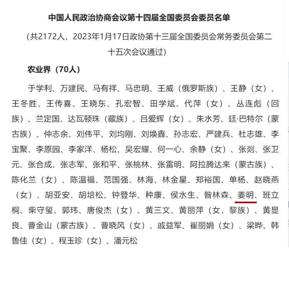 政协第十四届全国委员会委员共2172人,分别来自34个界别,姜明是农业界别当选70名委员之一。