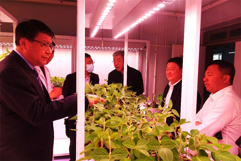调研组首先深入到东北亚种质资源研究中心,大豆分子设计育种重点实验室程志远博士介绍了实验室的组织构架、主要研究方向、人才队伍概况,以及在国内率先建成大豆分子设计育种技术体系和最大容量的大豆基因突变体库的情况,还详细介绍了吉林省最大规模的高通量自动化智能作物表型采集平台,汇报了大豆新品种的选育和示范推广有力支撑国家大豆产能提升工程等工作进展。