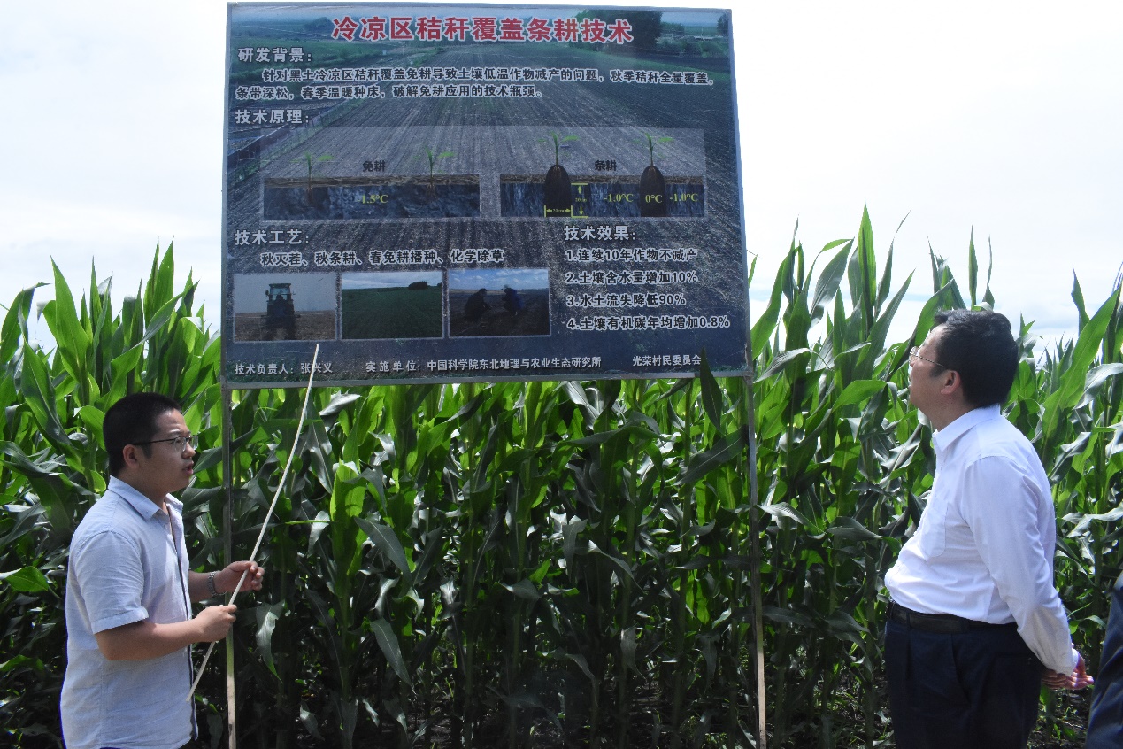 在张兴义详细介绍了黑土地农田水土流失防治保护性利用模式与应用万亩综合示范样板实施情况及应用成效后,叶玉江一行实地参观调研了耕地侵蚀沟秸秆填埋复垦技术、有机肥规模化快速沤制技术的应用示范,李建业博士重点介绍了寒地冷凉区秸秆覆盖条耕技术和暗管排水技术在黑土地保护与利用工作中的研发思路和推广应用情况。