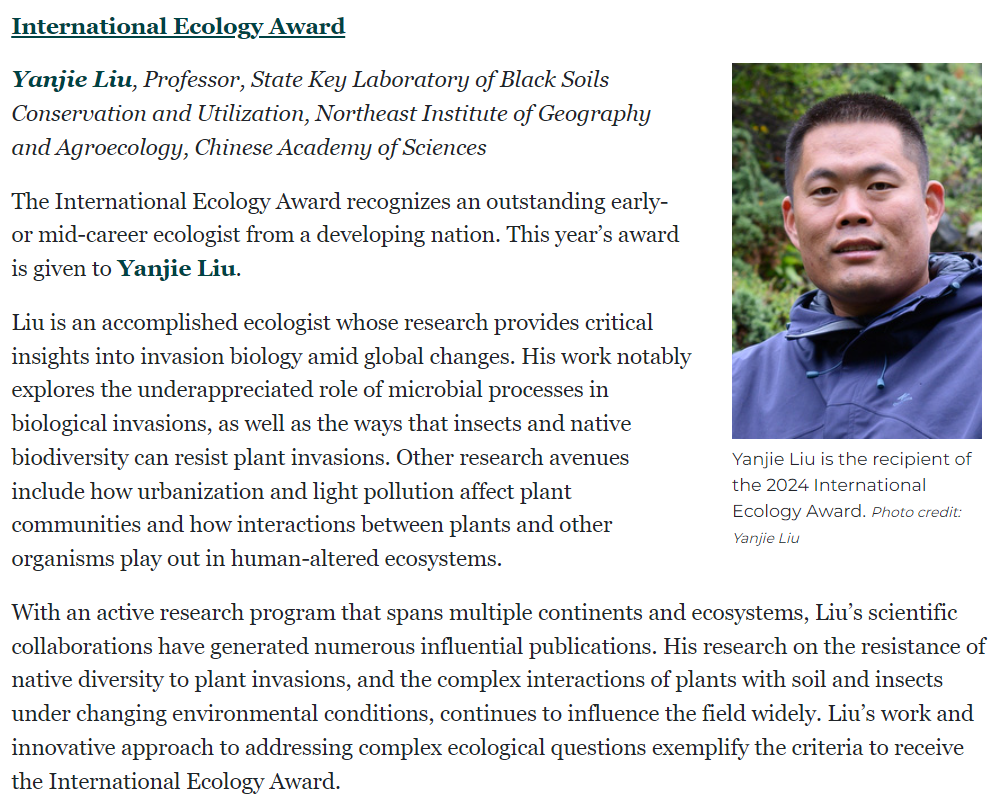 2024年5月30日,美国生态学会发布了“国际生态学奖”名单,中国科学院东北地理与农业生态研究所生物入侵生态学科组负责人刘艳杰研究员获奖。