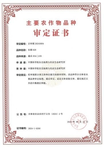 由中国科学院东北地理与农业生态研究所盐碱地资源与利用学科组杨福研究员水稻育种团队选育的耐盐碱抗倒直立穗香稻品种“东稻628”(审定编号:吉审稻20243004)2024年通过吉林省农作物品种审定,李景鹏高级工程师为该品种的第一完成人。