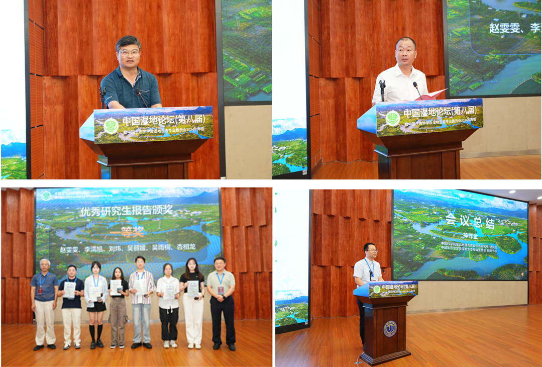 闭幕式环节由温州大学生命与环境科学学院副院长陈斌斌主持,温州大学生命与环境科学学院院长郑向勇教授宣布了获得优秀研究生报告奖名单,本次大会共有6个研究生报告获得一等奖,12个研究生报告获得二等奖,18个研究生报告获得三等奖。中国生态学学会湿地生态专业委员会副秘书长、东北地理所神祥金研究员对本次大会进行了总结,并宣布第九届中国湿地论坛举办地在湖南省长沙市,主办方为中国科学院亚热带农业生态研究所。中国科学院亚热带农业生态研究所李峰研究员代表下一届中国湿地论坛主办方发言。