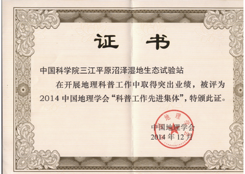 三江平原沼泽湿地生态试验站被评为中国地理学会2014年度 “科普工作先进集体”