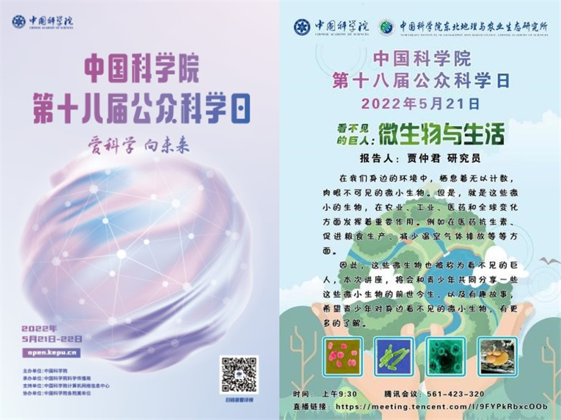 2022年5月21日,东北地理所“爱科学,向未来”第十八届公众科学日活动成功举办。疫情之下,本次科普活动全部采用线上直播,“黑土粮仓”科技会战总工程师贾仲君研究员做了题为“看不见的巨人:微生物与生活”主题科普讲座,300余名中小学生参加了线上活动。
