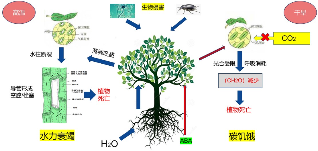 在高温和干旱环境下,水从树木的根部运送到叶片,在叶面蒸发成水汽带走热量;但是过于旺盛的蒸腾作用会导致导管中的水柱断裂形成空腔或栓塞,最后导致植物死亡。