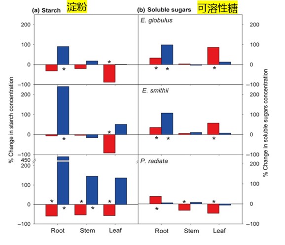 两种桉树根茎中的非结构性糖类(淀粉和可溶性糖)没有被大量消耗,如果在经历短期或低强度干旱后,水资源又重新变得充足,两种桉树会利用剩余的糖类迅速恢复正常生长。所以这两种桉树采用的是“保碳”(保存非结构性糖类(淀粉和可溶性糖),一旦短期内有水,便能迅速恢复生长)的策略。