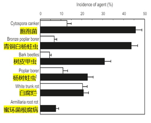 2017年,中国科学院华南植物园的黄建国教授分析了1930-2010年间虫害和干旱对寒带林杨树生长衰退的影响,并指出干旱和虫害会导致森林大面积死亡事件的发生(Huangat el.,2017)。