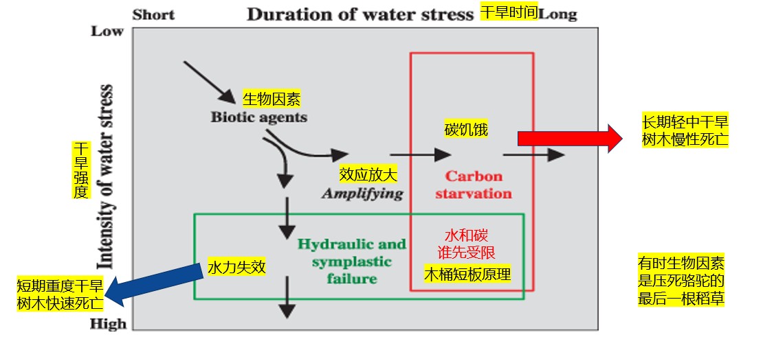 图9中红色框代表树木遭受到长期的轻中度干旱后,会发生碳饥饿,使树木慢性死亡;绿色框代表树木遭受到短期的重度干旱后,会发生水力衰竭,让树木快速死亡;而红、绿框重叠部分则表示水和碳谁先受到限制,谁就是导致树木死亡的主要原因。生物因素通常不是主要致死因素,但有时生物因素确实是压死骆驼的最后一根稻草。