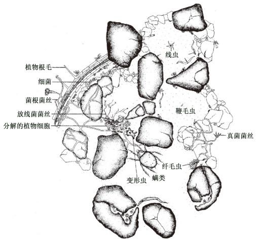 土壤生物是土壤具有生命力/活力的主要部分[5]。土壤生物由于主导了土壤生态系统的物质循环和能量流动过程从而使矿物态的母质发育成具有肥力的成熟土壤。在现阶段土壤生态系统中如此巨大的土壤生物多样性具有重要的生态意义。前面提到的动植物残体为什么没有堆积成山?为什么消失了?就是因为多种土壤生物共同参与经过一系列极其复杂的过程将这些死掉的生物残体分解。土壤生物在土壤生态系统中执行的有机物分解过程是实现元素循环和养分形态转化的基础。这些过程年复一年的进行,从而使土壤可以源源不断的为植物生长提供养分,也为我们人类生产了粮食。