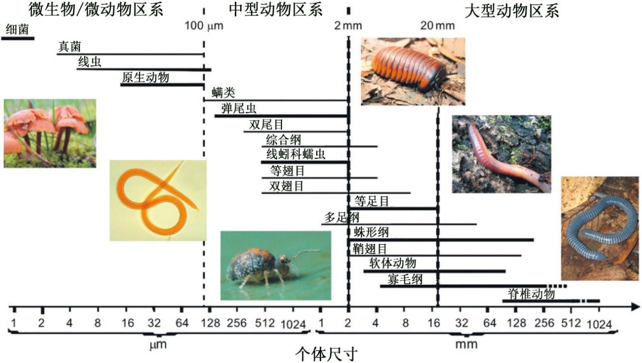 土壤微生境及土壤生物尺寸。(图片来源:参考文献[2]张志明整理)
